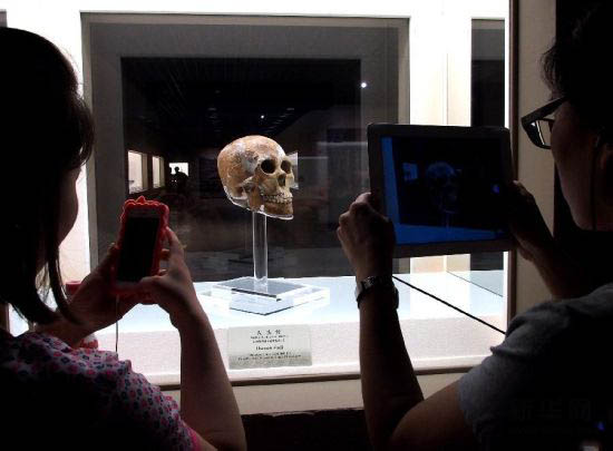 6月7日,游客在考古展上观看距今6000多年的成年男性头骨