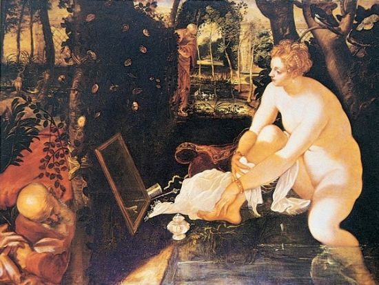 在众多对此题材的描绘当中,当属丁托列托的这一张《苏珊娜和长老》最为著名,丁托列托用艳丽的色彩和迷人的光线表现出苏珊娜光滑闪耀的肌肤,自然流畅的姿态,她那耀眼的光彩恰好与阴影中偷窥的两位长老形成对比。这一题材如此受到欢迎是很容易理解的,它既迎合了艺术赞助人和观众的色情观看欲望,又能够通过最为正当的理由将这一世俗需求合法化,和其他一些题材如《达纳厄》和《卢克蕾提亚》一样,提供了绘制女性裸体的借口,很少有其他艺术主题能提供如此令人满意的偷窥机会,长老们的偷窥行为无疑给这个题材添加了色情意味,而我们这些画外的观者事实上也成为偷窥的同谋者。约翰 · 伯格在《观看之道》中就曾指出这一题材反映出的性别问题,苏珊娜作为观看的对象出现在艺术作品中,其目的正是要讨好作为观看主体的男性。两个好色的长老既提供了图像的合理性,又增加了色情的效果,滔滔不绝地证明了男性的自我意识。