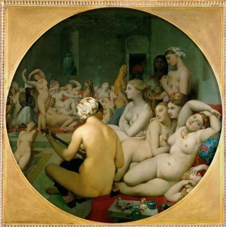 相比之下,同为弗兰德斯画派重要的巴洛克艺术家,伦勃朗的生平则充满坎坷,临终前甚至因经营失败而破产。伦勃朗与鲁本斯一样迎娶过两位夫人,他的第二任妻子亨德里克是他原先的女仆,二人的结合充满了坎坷。一方面是由于第一任妻子莎斯基亚去世前留下遗嘱,如若伦勃朗再娶将不能继承其遗产,况且,将女仆迎娶进门,在当时社会被视为通奸一样令人不齿。但亨德里克虽然目不识丁,却以坚韧的性格为伦勃朗打理着落魄的生活,成为他晚年的生活支柱。《亨德里克在河中洗浴》是一件充满爱意的作品,伦勃朗用富有激情的笔触描绘了亨德里克缓慢涉水时的生动倩影。提着连衣裙、蹑手蹑脚地探步下水的亨德里克,显示出女性特有的娇态,既胆怯,又温柔,富有一种自然天成的美感,这些特质都在她毫无修饰的姿态中和低垂的脸上表现出来。画家以粗犷的笔触,充满激情地描绘连衣裙,运用明亮与幽暗交织的色彩描绘环境,尤其是那如镜般的池塘倒影,使这位可爱的荷兰女子生动地展现于观众面前。 他者,来自东方浴室的情调 大旅行时代所带来的对东方异域风情的憧憬向往,造就了一批善画东方题材的艺术家,也在新古典主义与浪漫主义潮流中为我们留下了丰厚的艺术遗产。 土耳其浴室让这些摹古的旅行者们想起了曾经辉煌的罗马浴场,充满异国情调的华丽装饰,放眼望去几十甚至上百位裸露的浴女轻松嬉笑。英国笔记作家蒙塔裘女士随着丈夫前往伊斯坦布尔出任驻土耳其大使,她1717年4月1日写给朋友的信,描述了她在索菲亚城第一次看见土耳其浴的情景:圆顶的石造澡堂内,200多位妇女都一丝不挂。但在那里,丝毫没有轻狂的嬉笑和挑逗的动作。有的人喝咖啡,有的人吃果冻,或由仆人帮忙梳头编发。这场景何其震撼,激发了包括安格尔、夏塞里奥等艺术家的创作热情,留下了丰富的土耳其浴室题材作品。