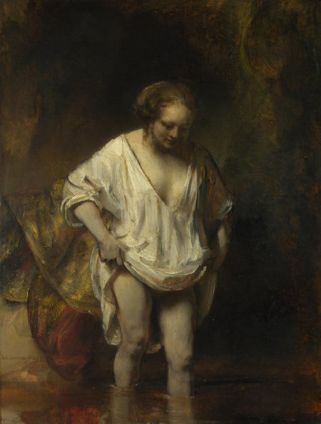 私密空间,出浴的爱人 当对裸体女性题材的表现不必再假借神话或圣经故事,浴女们便走出神龛来到了人间。不过,即便如此,画家们想要在画面中表现一个陌生的裸体洗浴的女性也是师出无名,于是,将裸身出浴的情人、妻子搬上画面便成了许多艺术家的拿手戏。 沐浴中或沐浴后,面对着自己最亲密的爱人,是最为私密放松的时刻,艺术家们在画面上呈现出的正是这一刻,没有造作的“摆拍”,也没有虚拟的环境和场景,这些裸体肖像最为自然生动,满溢着感情,让画外的欣赏者仿佛也能感受到艺术家充满爱意的凝视目光。鲁本斯的生平大概是所有艺术家的理想范本,他不仅艺术上才华横溢,更能在国家外交和工作室经营上都表现得游刃有余,一生享尽荣华富贵。就鲁本斯个人而言,人文主义的追求,更多地体现在对情感的放纵与生命力的旺盛的赞颂,而并不在于人物内心的刻画或悲天悯人的倾诉。鲁本斯先后迎娶了两位绝色娇妻,以她们为模特创作了大量充满生命力的佳作。尤其是第二任妻子海伦娜,嫁给53岁的鲁本斯时年方二八,青春与美貌是海伦娜作为画家模特最好的资本,她那忽闪忽闪的大眼睛充斥着鲁本斯后期的创作,鲁本斯甚至将她化身为缪斯之神,留下了《披上毛皮的海伦娜·芙尔曼》这样的经典之作。海伦娜直视画外的观者,充满了自信,幽暗的背景衬托着明亮的人物造型,海伦娜侧身站在浴池旁边,红润饱满的肉体和吹弹可破的肌肤被鲁本斯恣意潇洒的笔触所强化,脚下的红色增添了画面的温暖感,在大面积深色的画面中显得华丽高贵,边缘线的暖色运用与之相呼应,让人物充满生气。