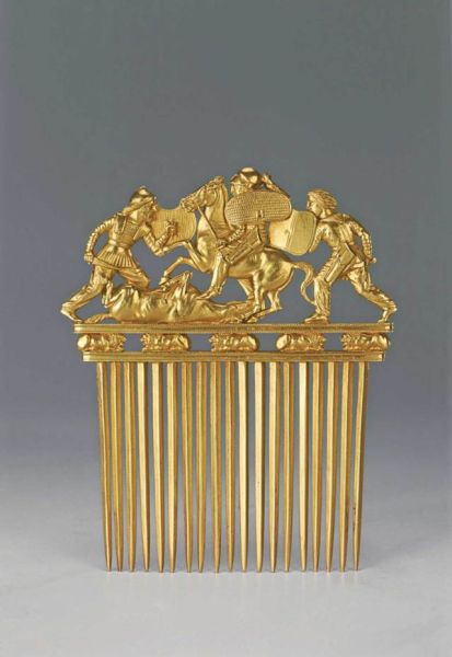 作者不详,描绘斯基泰人作战场景的梳子 公元前5世纪至公元前4世纪 1912年-1913年由考古学家NikolaiVeselovsky在乌克兰第聂伯河区的Solokha Barrow发掘 1915-1964
