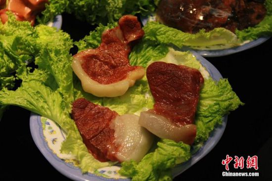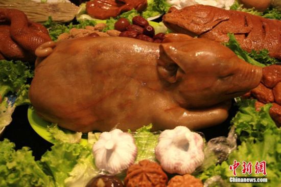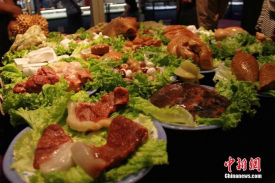 10月10日,一套造型逼真的“石制”满汉全席亮相西安,栩栩如生的“美味”令人垂涎欲滴,引得游人啧啧称奇。