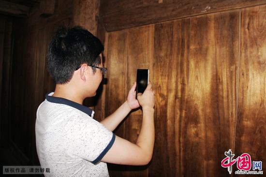 7月14日,一位游客在湖北恩施林博园内用手机照楠木民居上的金丝